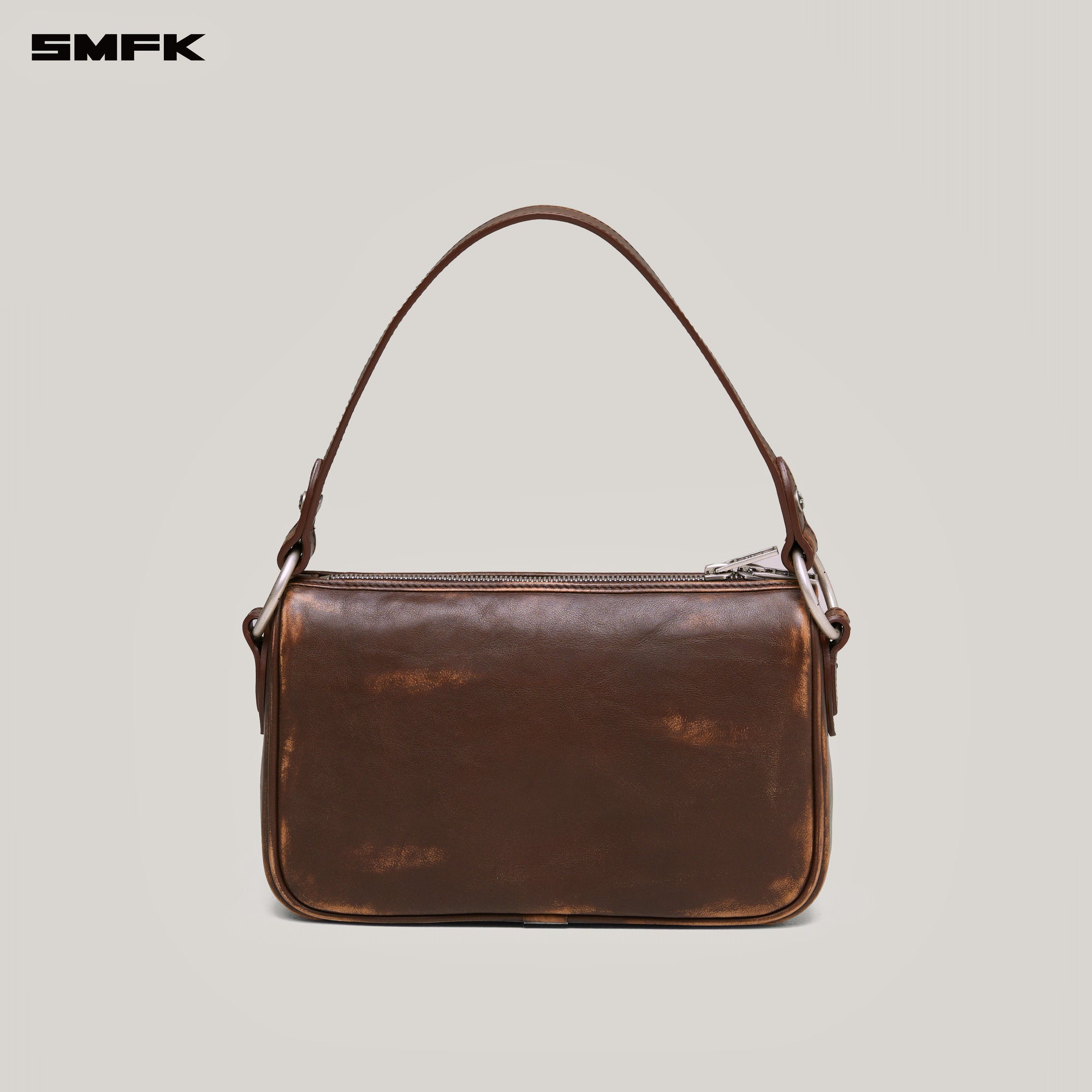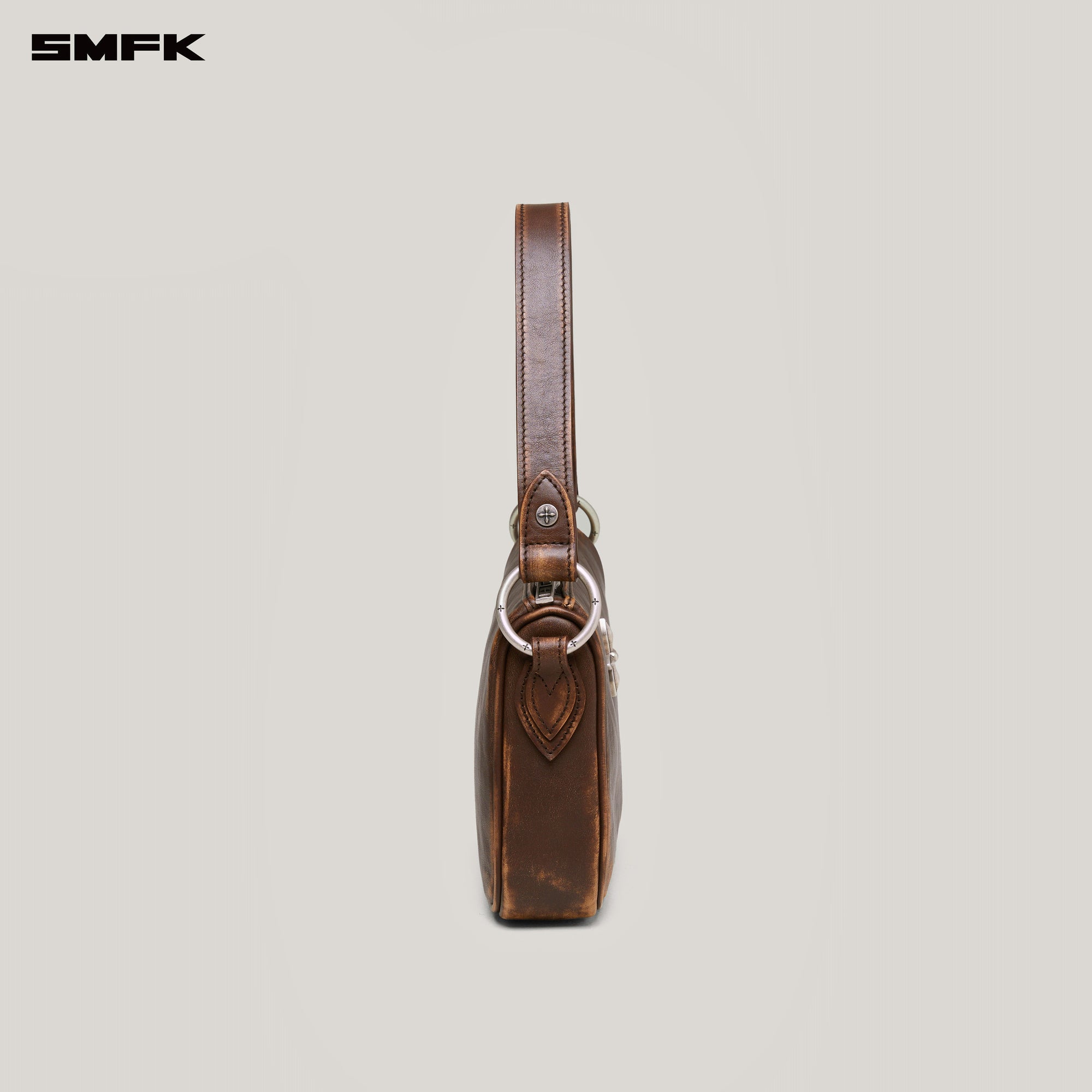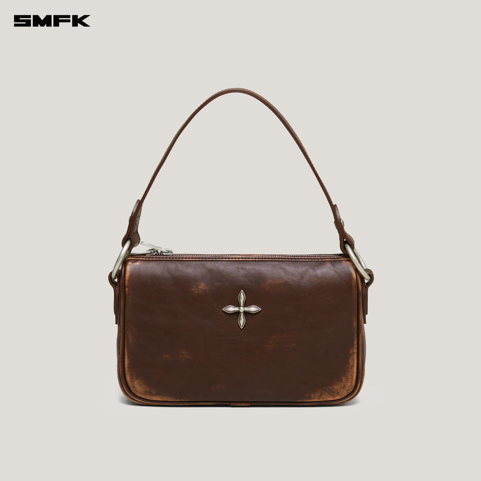 It is made with a wild and natural design style, using hand-fading and multiple thin edge oil coating processes. The zipper of SMFK's leather bags is processed with exquisite leather edging technology to ensure that the zipper of the leather goods maintains a stable shape for a long time. A COMPASS cross badge is embedded in the center of the bag. The color scheme is inspired by trees and forests. The brown rubbed leather is manually faded to create a two-color effect, similar to the craft of painting. It implies that all things will fade away over time, no matter how complex the modifications are, revealing their true colors and essence, returning to nature.