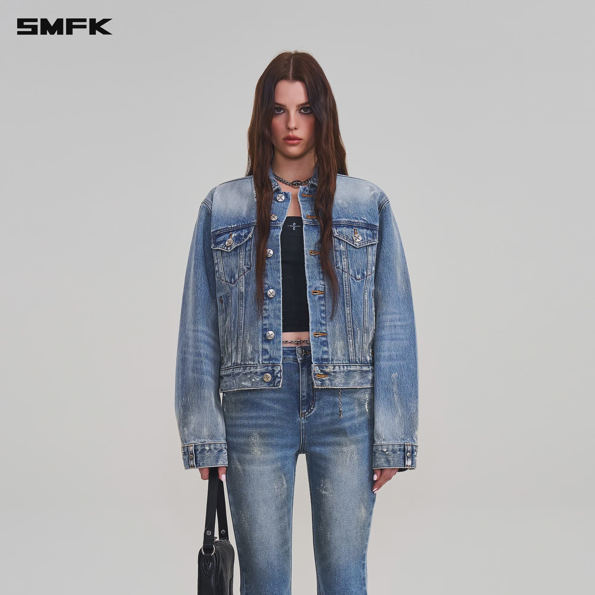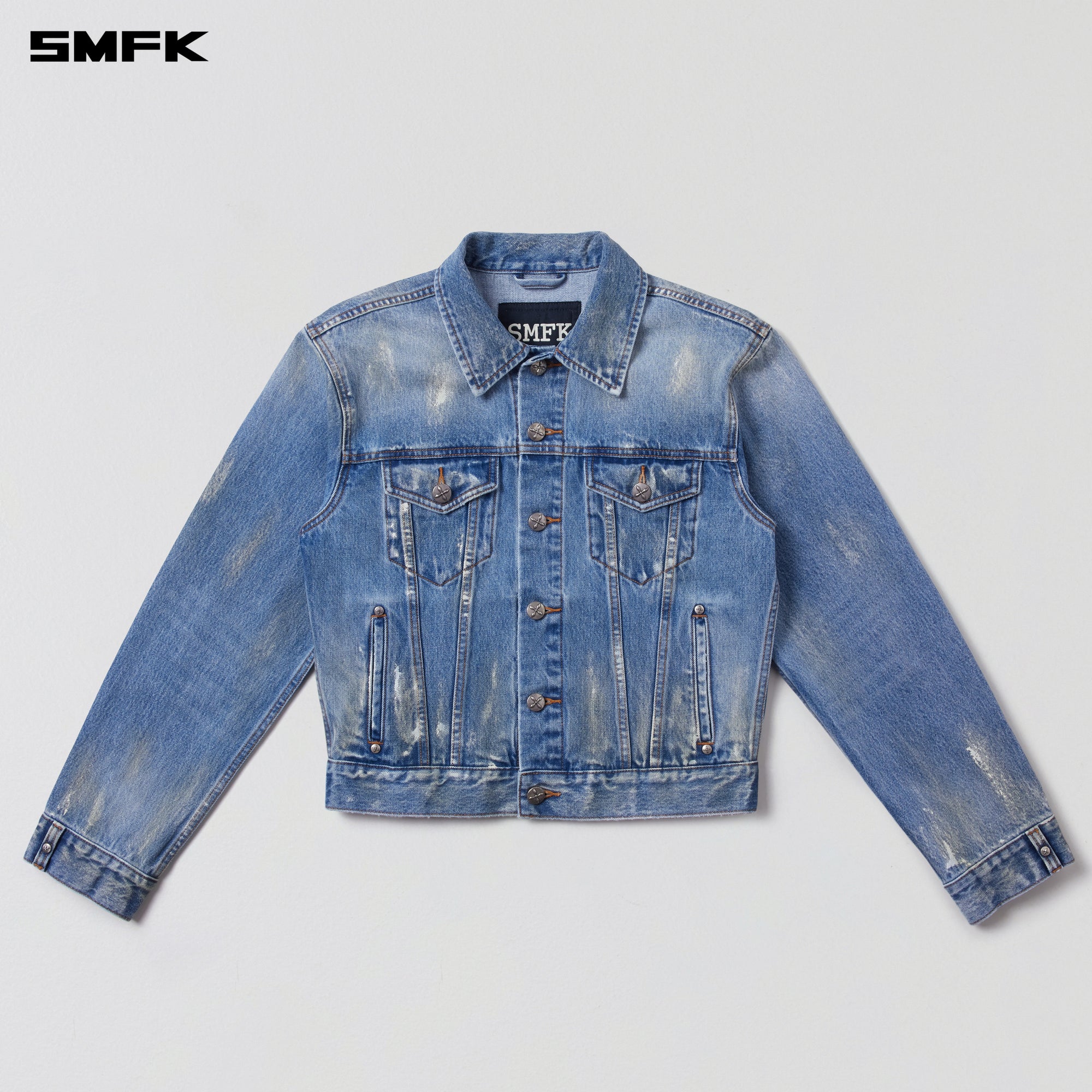 - Design:SMFK COMPASS Classic Series, Slim-fit Biker Jacket in Denim Part of the 2026 Wasteland Collection, crafted from 13.5oz heavyweight denim. Building upon a classic indigo base, it undergoes hand-painted artistry and vintage distressing, finished with multiple stone washes to achieve a muted grey cast and speckled patina. - Features the signature COMPASS cross-stitch pattern on metal buttons. - Iconic cuff tab detailing. |