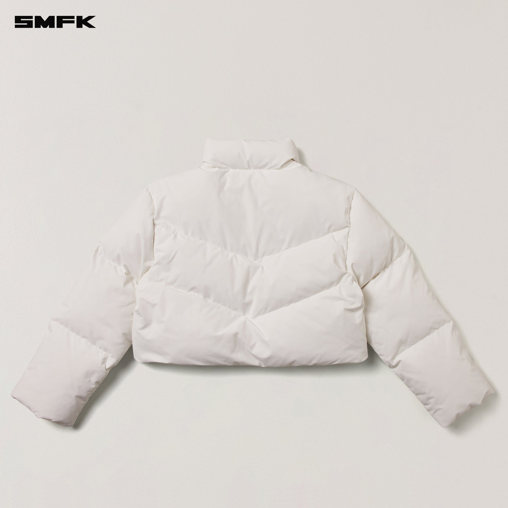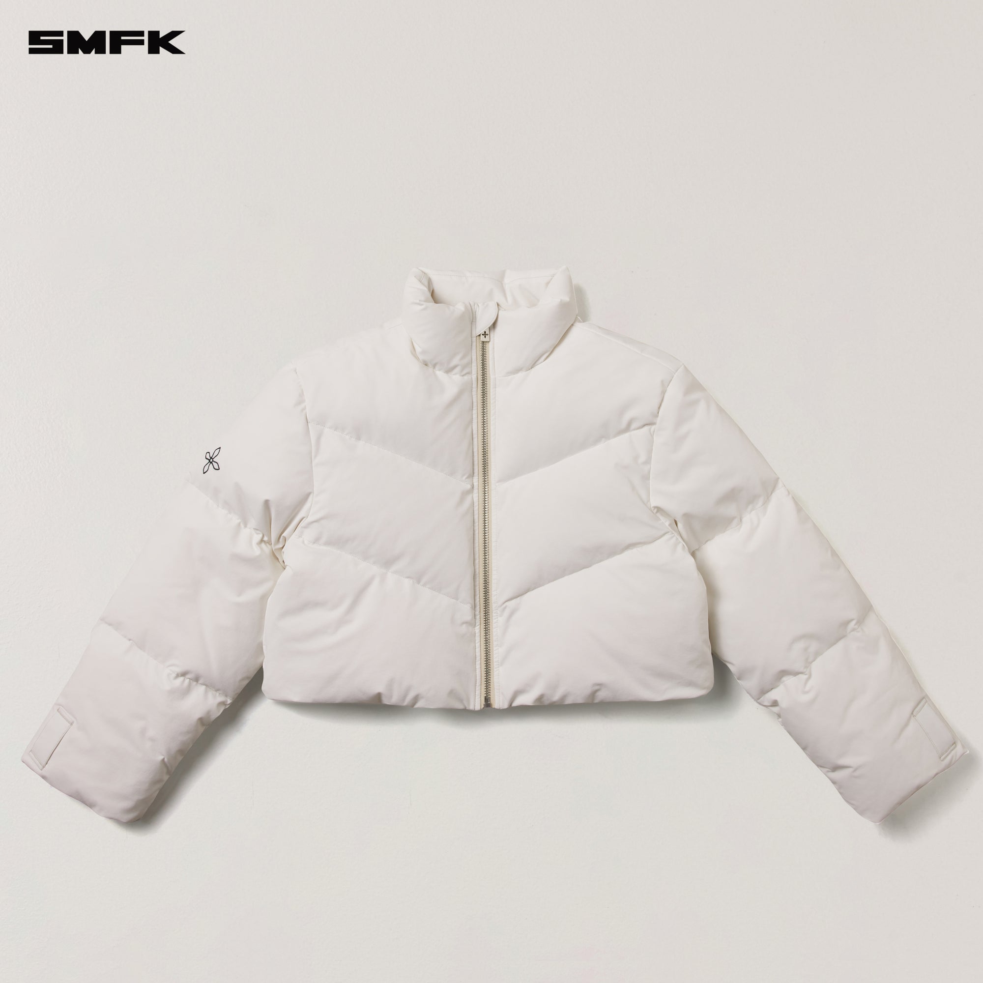 Design: SMFK's outdoor down collection features a lightweight design. Outdoor short down jacket with a stand-up collar and minimalist design, featuring invisible trim at the cuffs and hem. SMFK's signature rectangular loops at the cuffs. Chain cross pattern embroidered on the arm.
