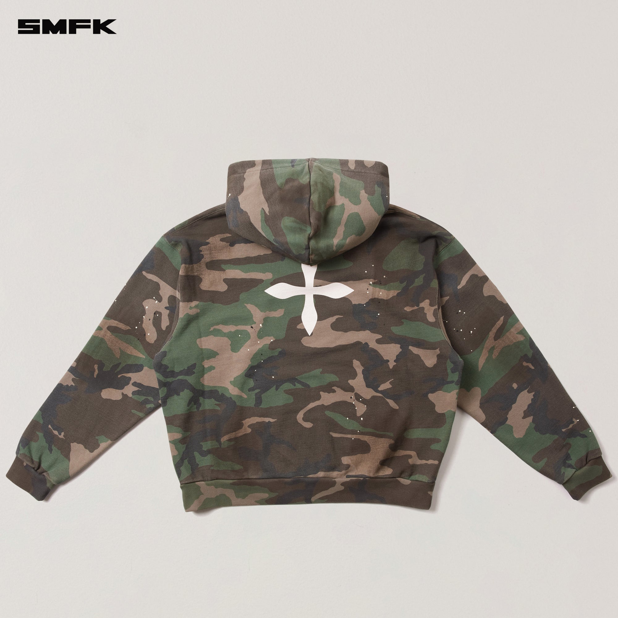 Design: SMFK ICON Classic Series carries the wild nature of solid colors, camouflage, and animal prints, reflecting the brand's DNA with concise and direct design and cutting style.SMFK ICON sports zip-up hoodie, loose silhouette, is the first series launched by SMFK in 2016-2017, which has evolved through multiple generations and continues to this day.Cross-shaped chain-stitch embroidery on the left chest.COMPASS cross flag printed on the back.600g thick cotton knitted sports fabric, washed for fading and surface abrasion, giving the entire piece a matte, low-saturation rock-like texture.